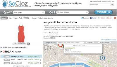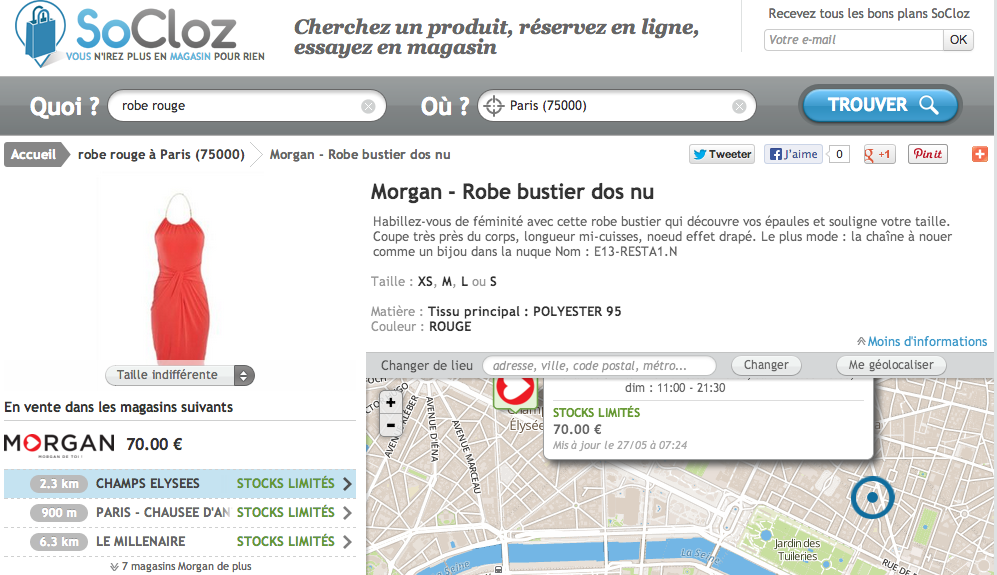 Start-up sortie des cartons en 2010, Socloz se présente comme un assistant shopping. Il permet de visualiser sur une carte les magasins proposant le produit recherché, indique les horaires d’ouverture et les promotions, et permet de vérifier la disponibilité du produit et même de le réserver. Ce site annonce déjà plus d’1,3 millions de produits recensés et 9000 magasins partenaires. Reste à rendre cette appli disponible sur mobile, on s’étonne que ce ne soit pas déjà le cas. Socloz prévoit de faire payer les enseignes pour chaque client qui achète un produit du magasin à partir d’une réservation sur son site. Et oui, il y a des pure players qui assoient leur business model sur la réalité du chiffre d’affaires !