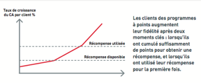 Ce point est contre–intuitif : il est tentant de penser que la non-transformation des points est autant d’économisé pour l’enseigne. L’expérience montre que ce raisonnement est erroné. Les clients qui utilisent leurs primes sont ceux qui augmentent le plus leur consommation (cf. schéma). Le CA additionnel fait plus que compenser le coût des récompenses utilisées. Et cela prouve aux clients que les promesses sont tenues, et que le programme génère de vrais avantages.